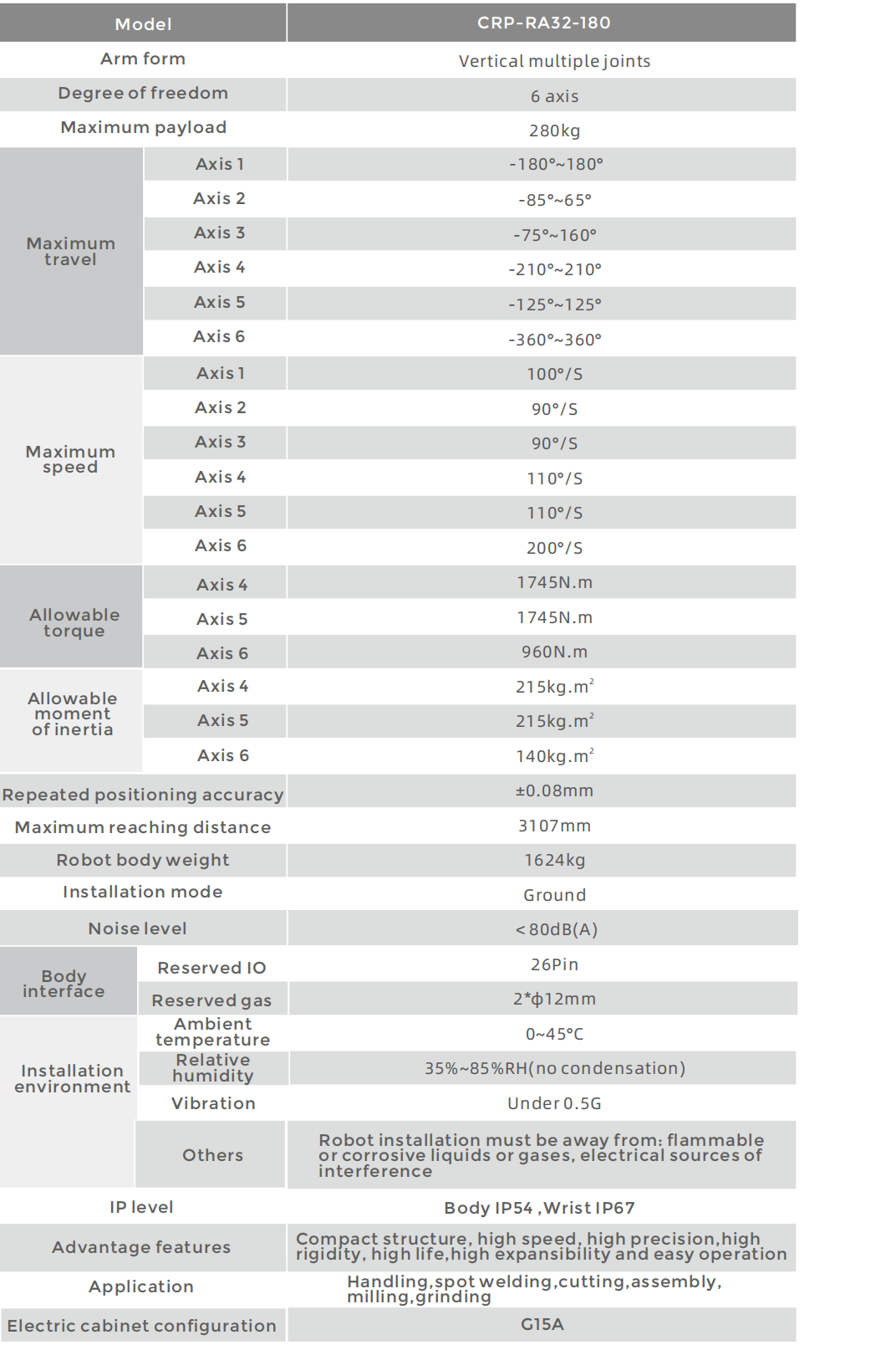 The body adopts the hollow arm structure and the built-in wrist cable, without considering the interference with the adjacent robot or peripheral equipment caused by the external winding mode.